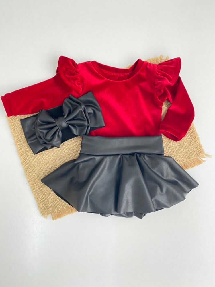 Σετ κόκκινο κορμάκι με δερμάτινη φούστα