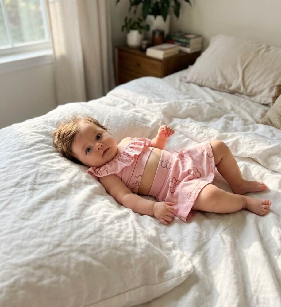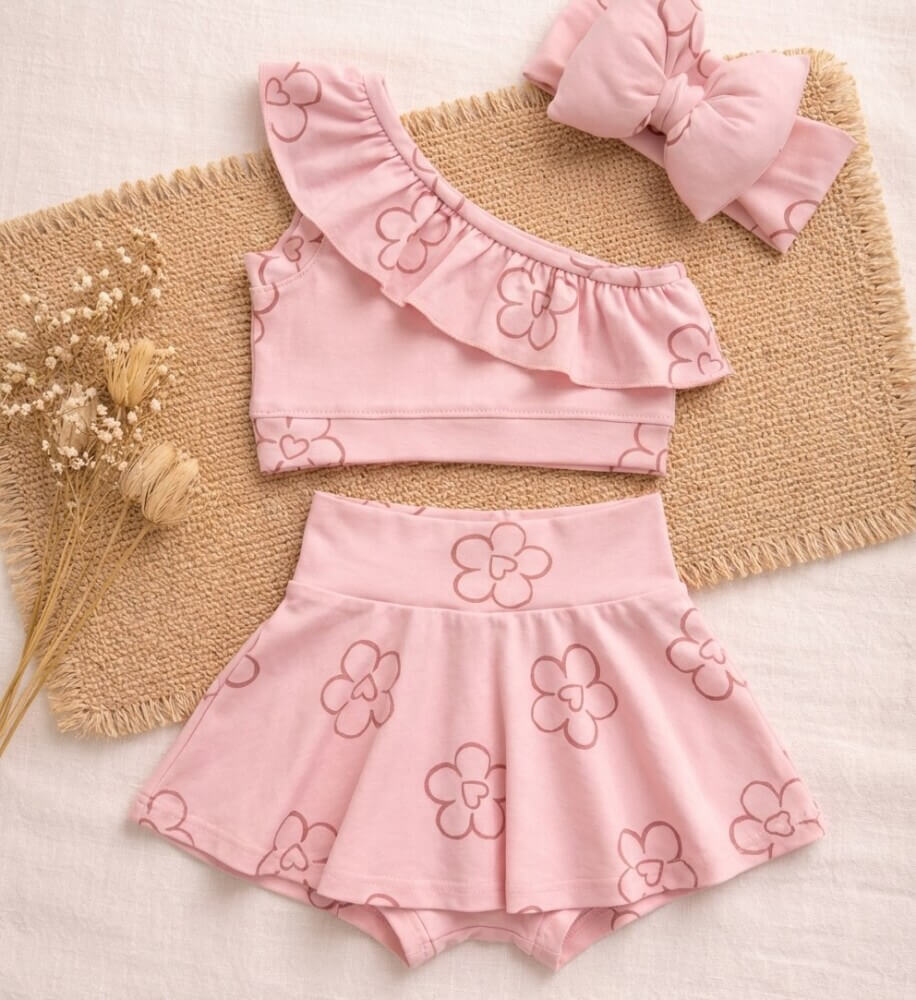 Το σετ αποτελείται αποτελείται από ένα μοντέρνο τοπ με ένα ώμο και βολάν, αέρινη φούστα-σορτς και ένα χαριτωμένο ασορτί φιόγκο.Το 95% βαμβακερό απαλό και ελαστικό ύφασμα προσφέρει άνεση και ελευθερία κινήσεων, ενώ το ρομαντικό σχέδιο χαρίζει μια ιδιαίτερα γλυκιά εμφάνιση.
